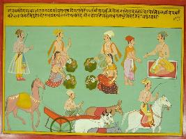 | Description / विवरण | Miniature painting based on Mahabharat - Rajdharma parva depicting animal like horse, donkey, camelare runing due to fear. Nobody cries in the king done which was led by Dharma and everybody eats in the kingdom. |