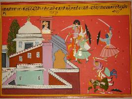 | Description / विवरण | Miniature painting based on Sanskrit drama Malti Madhav. It describe the fighting scene between Madhav and solders of king or father of Malti. It is an incomplete painting. |