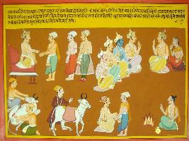 | Description / विवरण | Miniature painting based on Mahabharat - Rajdharma parva depicting Yudhisthir sitting with his brothers and Draupadi and talking at upper left part. Piercing animal nose is very painful activity. People are shown piercing at the lower right part. At the time of yagna, king should make daan. He is shown performing yagna and giving daan to another man. He should protect his people by killing enemies and making friends. |