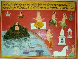 | Description / विवरण | Miniature painting based on Kashi khand depicting importance of Prayaga. Brahma and Vishnu are shown at upper level. Two men are shown going for worshipping at left part and a Shiv temple is depicted. At the right part, cyclone is shown coming in Prayaga city and Markand rishi is shown doing penance inside a vat tree and caught in cyclone. |