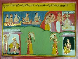 | Description / विवरण | Miniature painting based on Mahabharat - Udyam parva. It depicts Devta giving position of Indra to king Nahuk. He is shown being coronated by sages and Devta watching this. After getting position of Indra, he asked Urvashi to go Indrani and fetch her to him. Urvashi went to her but Indrani refused to go to him. |