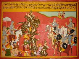 | Description / विवरण | Miniature painting based on Prithviraj Raso depicting a battle scene, between army of Panga and Prithviraj Chauhan. At one side, army wearing feathers of peacock came forward and fighting when king of Panga ordered them to fight. |
