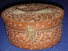 | Description / विवरण | Wooden container cylindrical in shape, with a lid and a handle at the top. The body is decorated with intricate designs all over it. |