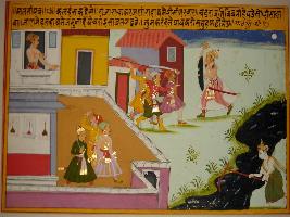 | Description / विवरण | Miniature painting based on Sanskrit drama Malti Madhav. It describe Madhav friend Makarand fighting with kings soldiers and some are standing inside the fort of king and on the right below Baldev trying to cross river. |