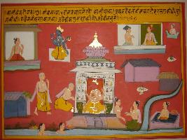 | Description / विवरण | Miniature painting based on Kashi khand depicting a scene from bank of river Ganga. A temple of Ganesh is depicted surrounded by many devotees, some taking dip in Ganga. |