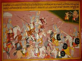 | Description / विवरण | Miniature painting based on Prithviraj Raso depicting Roysal running for catching Prithviraj and Atatai come forward and start fighting with Roysal. |