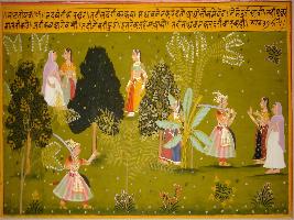 | Description / विवरण | Miniature painting based on Sanskrit drama Malti Madhav depicting a scene of garden in which Kamuki shown with malti, Makarande having sword and a scene in left side Makarand is being instructed by Kamuki and Malti. |