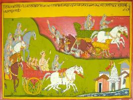 | Description / विवरण | Miniature painting based on Mahabharat - Rajdharma parva depicting several king fighting with Bhishma who is on chariot with three female in Varanasi. |
