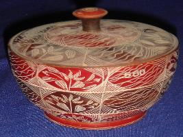 | Description / विवरण | Wooden container, slightly cylindrical in shape with footed base and lid which has a small knob for handling purpose. Its outer surface is painted with lacquer paint while inner surface is plain. |
