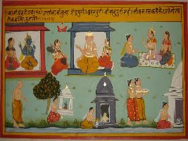 | Description / विवरण | Miniature painting based on Kashi khand depicting Vishnu sitting with goddess Lakshmi in his lok, Brahma with Saraswati in Brahma lok, Indra sitting with Indrani in his lok in upper level. At the lower right, Shivsharma is shown telling tirth is like visiting the different loks. To his left people are worshipping god in different tirthsthan. |
