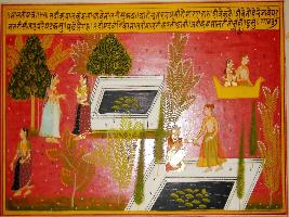 | Description / विवरण | Miniature painting based on Sanskrit drama Malti Madhav depicting a scene in which Malti talking to her friend near by a hauz tank . Malti hand s holded by a female monk hand s holded by female monk left below and top. She is being carried away by udan Jastan. |