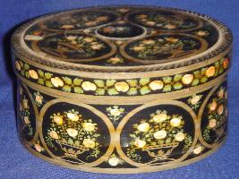 | Description / विवरण | Wooden container with lid, cylindrical in shape, with a depression to open and hold the lid. Floral designs are painted on black base. |