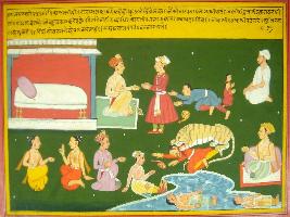 | Description / विवरण | Miniature painting based on Mahabharat - Rajdharma parva depicting raja Janak is telling about dharma and way of life of king and Brahmans. |