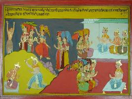 | Description / विवरण | Miniature painting based on Mahabharat - Udyam parva. Miniature painting based on Mahabharat - scenes form Udyam parva depicting apsaras dancing and a yogi perform yagna. It also depicts Indra attacking on a king with vajra. |