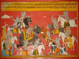 | Description / विवरण | Miniature painting based on Prithviraj Raso depicting fight between the army of Jaichand and army of Prithviraj. Elephant named Ramvat shown killing many men of Prithviraj in the way Kaal take lives. |