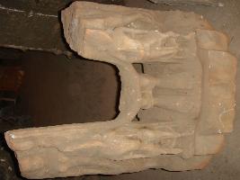 | Description / विवरण | Fragment of sculpture depicting lower part of the image is Vishnu. Only part of vanmala and feet of Vishnu is visible, wearing an anklet and pazeb. At his both sides two of his Ayudh purushs are depicted. At the right side a female figure is also depicted with Ayudh purush. The head of the female at left side is broken. |