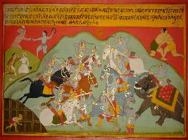 | Description / विवरण | Miniature painting based on Prithviraj Raso depicting war between army of Jaichand and army of Prithviraj. At the upper left, two wrestlers are shown fighting. At upper right Kambandh is shown fighting with another. Below this women are seen fighting. |