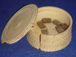 | Description / विवरण | Ivory container, circular in shape, with engraved geometrical design. The lid is partly broken. |