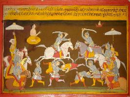 | Description / विवरण | Miniature painting based on Prithviraj Raso depicting fight between brother of Ravan Kotwal namely Veer and Prithviraj s Sardar Saran Solanki. At the extreme right, army of Jaichand is standing and sending Veer for war and from other side Saran Solanki is coming for war. Both of them are shown fighting with swords and getting killed. |