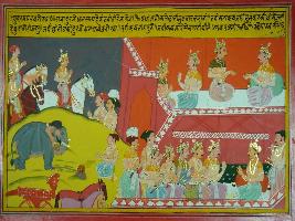 | Description / विवरण | Miniature painting based on Mahabharat - Udyam parva. Miniature painting based on Mahabharat - scenes form Udyam parva depicting messenger telling Duryodhan about Shalya s going towards camps of Pandavas. Duryodhan build up several resting place for his army and animals. |