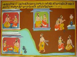 | Description / विवरण | Miniature painting based on Kashi khand. A sage and his wife is depicted doing various activity of daily life. A sage also is depicted marrying. |