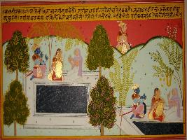 | Description / विवरण | Miniature painting based on Sanskrit drama Malti Madhav depicting in right part, Avalokita asking Malti about Madhav. All the 3 are sitting. In lower left part of the painting, Malti, Madhav and Avalokita are sitting and talking Makarand is depicted on upper part of the painting. |