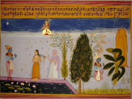 | Description / विवरण | Miniature painting based on Sanskrit drama Malti Madhav depicting Avalokita talking to Malti who just took both in pond. Madhav is depicted standing at the back of Malti. In left part, Madhav is seated beneath tree. |