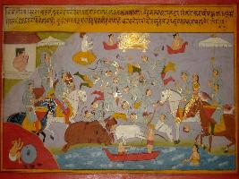 | Description / विवरण | Miniature painting based on Prithviraj Raso depicting eighth day of the war between army of Jaichand and Prithviraj which is Friday. Seven Sardars of Prithviraj died. At the extreme left, Prithviraj is seen sitting with Sanjogita on his horse. At the upper middle, Shiv is seen making garland of heads, it is to depict the number of men died in war. To its right sun is depicted with other Devta figures. At the upper left, a man and woman are making love. |