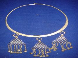 | Description / विवरण | Hasli, neck ornament, it is circular in shape with loop locking system. There are three triangular hangings with circular jali designs in it, with chain hangings and ghungaroos at the bottom. |