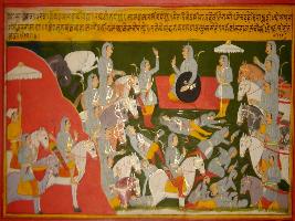 | Description / विवरण | Miniature painting based on Prithviraj Raso depicting war scene between army of Panga and army of Prithviraj. At the left side, Prithviraj is seen sitting and Kanha, one of his Sardar is seen raising his hand, Besides him, his other Sardars are depicted. At the middle soldiers are depicting lying dead. |