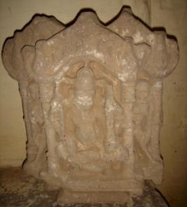 | Description / विवरण | Independent sculpture of four armed Brahma in seated posture. Attributes from right below a Varada mudra b Shruva c Manuscript d Kamandal. He is sitting under a pillared niche and flanked by standing female attendants on both the sides. |