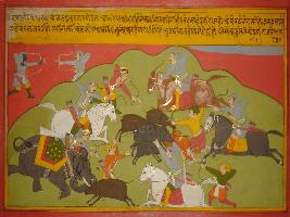 | Description / विवरण | Miniature painting based on Prithviraj Raso depicting war scene. Prithviraj is seen surrounded by men of king Panga and fighting with them in the way Arjun fought with Kauravas. |