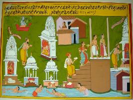 | Description / विवरण | Miniature painting based on Kashi khand depicting that Raja Harishchandra took holy dip in Ganga and 1st worships Shiv, then Bhavani and then Vinayak. He is accompanied with rishi Bhardwaj. |
