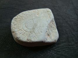 | Description / विवरण | It is a Terracotta stone, shaped like a celt. One end is broader and straight the other end is semi circular and narrow with a perforation. Its front side is incised with criss cross pattern. |