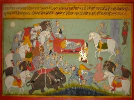 | Description / विवरण | Miniature painting based on Prithviraj Raso depicting a scene in which a soldier lying down on earth a lady is seated toward his head. All the soldiers surrounded him. A jackal is also seen. |