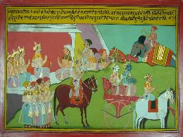 | Description / विवरण | Miniature painting based on Mahabharat - Udyam parva depicting everybody in Pandavas side discussing about the matter that how to get state s rule from Duryodhan. Dhrupad said that the only way is war and after deciding for war, they sent a messenger. Balram and Krishna moves towards Dwarika while Dhrupad send his Purohit as messenger to Hastinapur. It also depicts Bhishma and others in Hastinapur. |