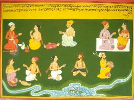 | Description / विवरण | Miniature painting based on Mahabharat - Rajdharma parva depicting difference between yoga nad viyoga and importance and yoga sadhana. |