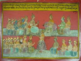 | Description / विवरण | Miniature painting based on Mahabharat - Udyam parva depicting Pandavas and their relatives came to state Virat for marriage of Abhimanyu. Raja Virat and Dhrupad come and Yudhisthir ask him respectfully to sit wish them. Balram and Satyaki seated besides Dhrupad while Krishna and Yudhisthir sat besides Virat. Virat s son Uttar sits besides Bhim, Arjun and Dhritdyumna and Dhritdyumna talking to them. |
