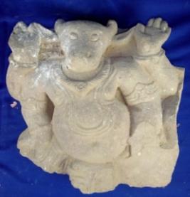 | Description / विवरण | Architectural fragment depicting a four handed seated male figure who has bull head. His upper two hands are raised upward and lower right hand rests on thigh. His left lower palm and legs are chopped off only toes of left leg is visible. He is adorned with jewels. |