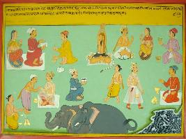 | Description / विवरण | Miniature painting based on Mahabharat - Rajdharma parva. Ayurvigyan is helpful for curing the patients from disease, it is also told here that they know about chemistry. Here about curing and life has been depicted. |