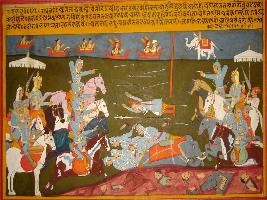 | Description / विवरण | Miniature painting based on Prithviraj Raso depicting Devtas including Indra watching the battle, where the river become red with blood and many army died. Atatai fought bravely and killed may men of Jaichand. At right side Jaichand is depicted while at left side Prithviraj and Sanjogita is depicted on horseback. |