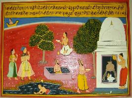 | Description / विवरण | Miniature painting based on Kashi khand depicting Chandra taking a bath is a pond then shown going for worshipping of Shiv. A boy is shown taking a bath in a river Ganga, then shown pouring water on linga and is shown doing meditation. At the right part king Jaidrath is shown walking with his wife. |