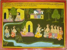 | Description / विवरण | Miniature painting based on Mahabharat - Vana parva. Lomash rishi is depicted telling Pandavas that this way leads to Mandranchal and all the Pandavas should be cautious, Devbhumi lies ahead where gods roam here and there. Many sages with nuts are depicted on the other side. |