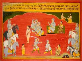 | Description / विवरण | Miniature painting based on Prithviraj Raso depicting Prithviraj waking up after consciousness and Sanjogita beside him. It also depicts a soldier approaching Prithviraj and other soldiers surrounding him. |