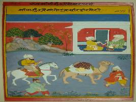 | Description / विवरण | Miniature painting depicting Akbar and Mullah-do-Piyaja talking . on top. On the lower part a solider is depicted riding on horse and a man going with his good on camel, showing the protective nature of soldiers and one can more frelly without worrying about theives and robbers. |