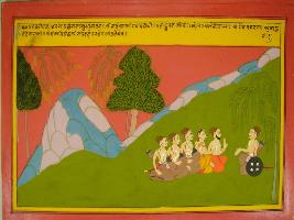 | Description / विवरण | Miniature painting based on Mahabharat - Vana parva depicting Yudhisthir bestowing Bhim with blessings while he is going for Penance. Draupadi says that she also wants to go with Bhim for penance. |
