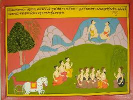 | Description / विवरण | Miniature painting based on Mahabharat - Vana parva depicting Bhim is telling that he will come with Draupadi to other lok. There he will meet Arjun and sent chariot for him, Nakul and Sahdev. |