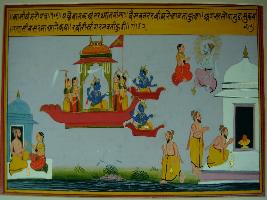| Description / विवरण | Miniature painting based on Kashi khand depicting Vishnu seated in ornated viman, four ladies acting as chauri bearers. At lower right part a rishi telling something to a lady in front of a temple. At lower left part rishi is shown praying Shiv linga in the temple. |
