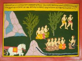 | Description / विवरण | Miniature painting based on Mahabharat - Vana parva depicting Yudhisthir talking to his brothers and Draupadi at lower left part. Three sages are shown sitting and meditating at the centre two animal headed men are depicted at the upper left part. |