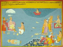 | Description / विवरण | Miniature painting based on Mahabharat - Rajdharma parva depicting Anga, here is depiction about the various donations he had made. |